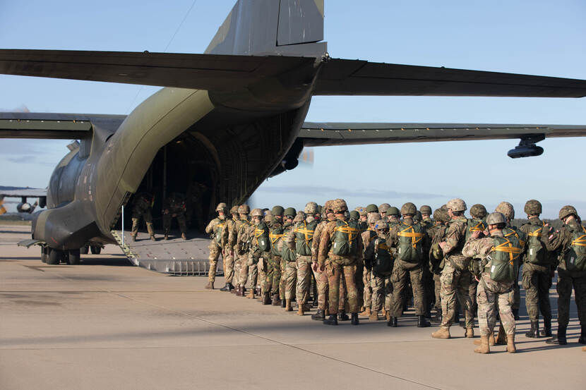 Dit jaar geen paradrop ter gelegenheid van de herdenking van Market Garden. Een jaar geleden zag de wereld er nog heel anders uit. Parachutisten uit verschillende landen staan keurig in de rij, klaar om aan boord te gaan van een transportvliegtuig voor hun sprong op de Ginkelse Heide. Volgend jaar dan maar weer? Foto: Staff Sergeant Austin Berner.