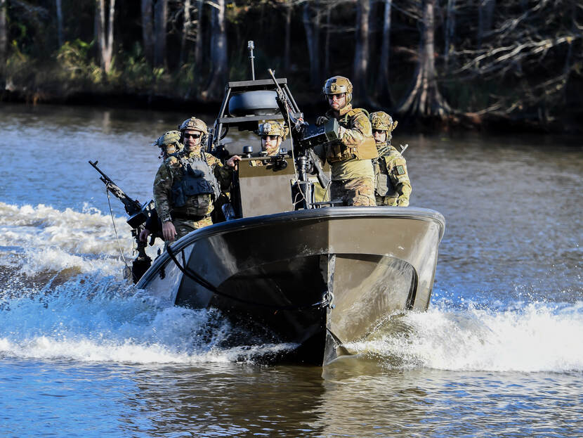 Het lijkt een beetje op een aanval van het A-team, maar deze militairen van de landmacht zijn zeker geen acteurs. Ze trainen in Amerika hoe ze moeten omgaan met kleine vaartuigen en oorlogvoering op het water. Een opname uit december 2019. Foto: Michael Williams.