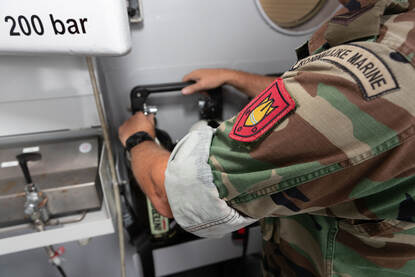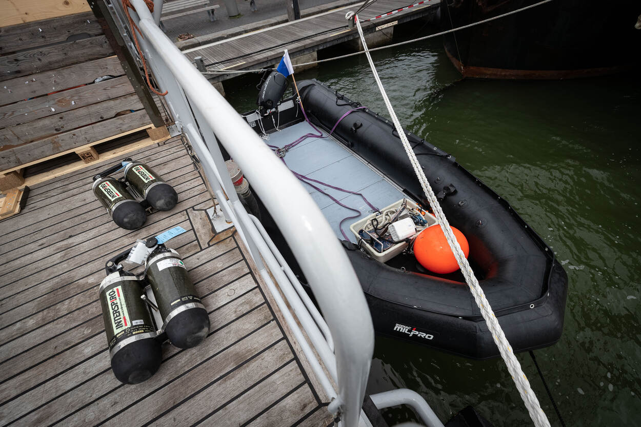 Omdat ankeren boven de dumplocatie niet mag, vaart de Cerberus tijdens de werkzaamheden in de buurt rond met de decompressietank voor de duikers aan boord. Het duikteam gaat met een kleinere rubberboot naar de specifieke duiklocaties. Op de bodem hebben de duikers niet meer dan 1 meter zicht, maar dat is genoeg om te zien wat ze doen. De opdracht: 5 tot 6 stuks van elke soort munitie naar boven halen. En er ligt veel, weet In de Braekt: “Van .50-kogels tot grote granaten en antitankmijnen.”