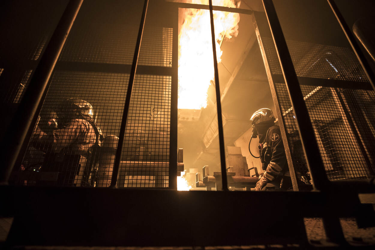 Hoe je moet handelen in een ruimte vol vlammen en rook hoort ook bij het werk van de Gewapende Beveiliging Burgerluchtvaart van de Koninklijke Marechaussee. Onlangs hadden deze specialisten een oefening op het Brandweer Opleidingscentrum Amsterdam Amstelland Schiphol. Op dit complex kunnen vele scenario’s op een realistische manier worden beoefend. De foto is van de getalenteerde luchtmachtfotograaf sergeant-majoor Maartje Roos.