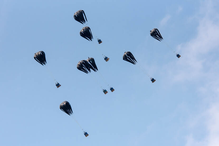 Nog een opname van sergeant-majoor Hoek die hij tijdens de International Airdrop Week (IAW) nam. Voor deze exercitie brachten de Amerikaanse strijdkrachten hun LCADS HV mee, voluit Low Cost Aerial Delivery System High Velocity. Deze vinding bestaat uit eenmalig te gebruiken parachutes, waarmee je ladingen tot duizend kilo kunt droppen vanaf hoogtes tot maximaal 25.000 voet. Het was voor het eerst dat Nederlandse C-130 bemanningen tijdens IAW dit systeem gebruikten om het ‘riggen’ en ‘droppen’ te beoefenen. De eerste vernederlandste kreet is overigens een vakterm voor ‘klaarmaken voor gebruik’.