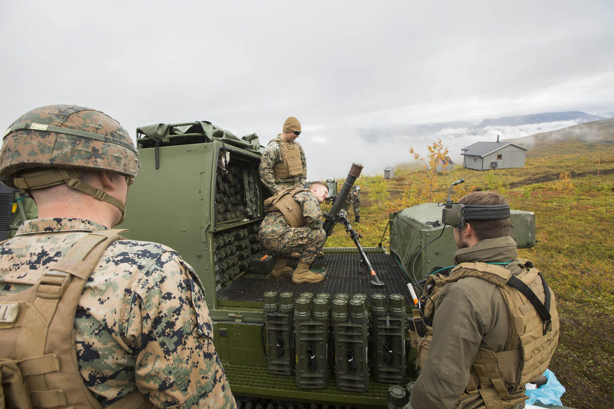 Amerikaanse en Nederlandse mariniers hebben heel veel gemeen en kunnen goed met elkaar oefenen. Dat deden ze ook tijdens de recent gehouden - Nederlands geleide - Fire Support oefening in het Noorse Setermoen. Op de foto maken zeesoldaten van over de grote plas kennis met de ins en outs van een 81 mm mortier, gemonteerd op een BV206 mortier carrier. U.S. Marine Corps fotograaf sergeant Abrey Liggins nam het beeld voor zijn rekening.
