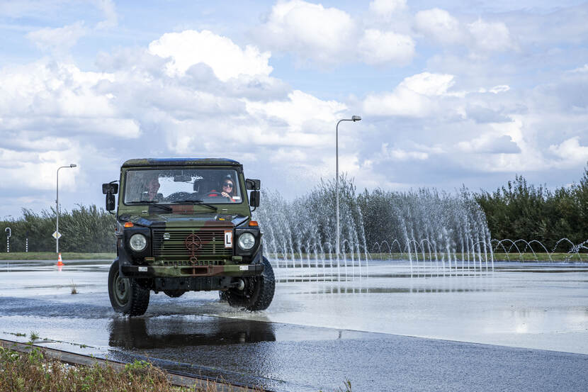 Defensiefotograaf sergeant Cinthia Nijssen klikte staatsecretaris Barbara Visser op het moment dat ze met een MB terreinwagen een slippertje maakte. Gelukkig zorgde een ervaren instructeur van het Opleidings- en Trainingscentrum Rijden ervoor dat alles goed afliep. De 1 na hoogste baas van Defensie reed na afloop van haar werkbezoek aan de Strijpse Kampen gezond en wel de kazerne af.