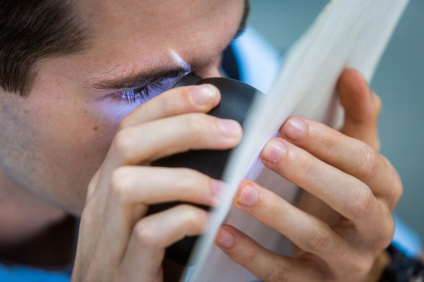 Freelance fotograaf Jarno Kraayvanger bezocht de recent gehouden training in Apeldoorn van het Europese grens- en kustwachtagentschap Frontex. De deelnemers waren afkomstig van marechaussee en politie. Frontex helpt landen die onder het Schengenakkoord vallen met raad en daad bij het beschermen van hun buitengrenzen. Op de foto draait het allemaal om het herkennen van een vervalst paspoort.