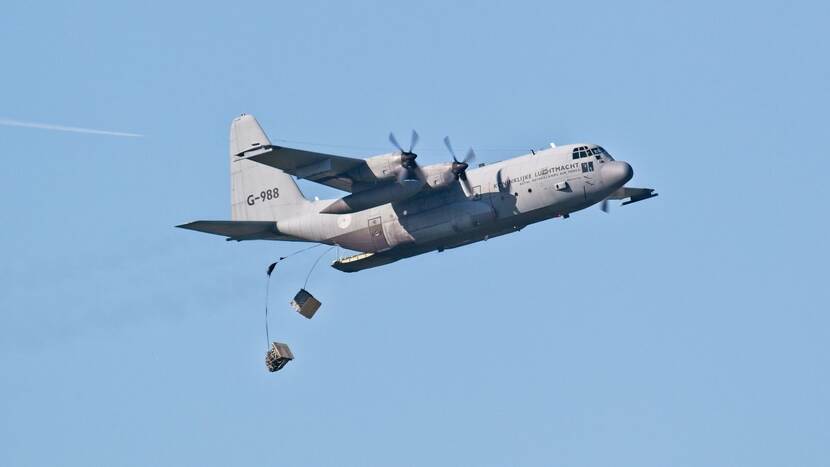 Van Anno Gravemaker komt deze fraaie kiek van een Nederlandse C-130 Hercules tijdens de onlangs gehouden internationale luchtmobiele oefening Falcon Leap. Bij die gelegenheid deden de bemanningen van 336 Squadron (Vliegbasis Eindhoven) waar ze goed in zijn, namelijk het droppen van vracht. De foto is genomen boven het militair luchtvaartterrein Deelen. Op de Ginkelse Heide werden door 336 paradroppings uitgevoerd.