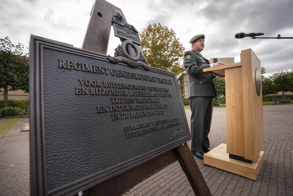 “Tot 1869 was geneeskundige verzorging een neventaak binnen de infanterie. Daarna werd het een hoofdfunctie en zorgden medisch geschoolde militairen daarvoor. Sindsdien moet bij elke missie en inzet de geneeskundige verzorging gegarandeerd zijn. Anders is de kans groot dat de inzet niet doorgaat, daar moeten we ons niet in vergissen. De Commandant Landstrijdkrachten was genegen om het Regiment te waarderen voor de inzet sinds de oprichting. Voor het eerst is het Bronzen Schild aan een regiment als geheel uitgereikt. En dat in een voor ons extra bijzonder jaar, nu we in de schijnwerpers staan door de nationale inzet in het kader van de bestrijding van COVID-19.”