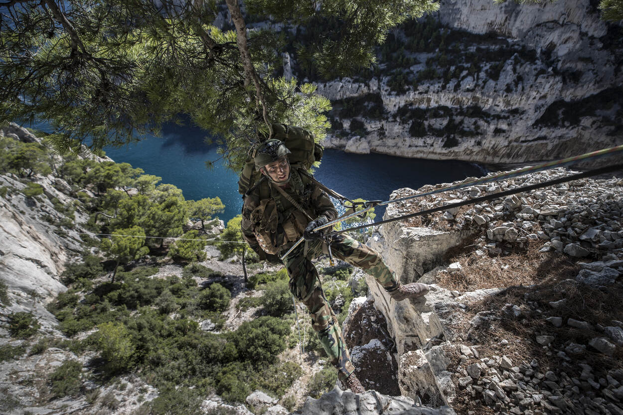 Luchtmachtfotograaf sergeant-majoor Maartje Roos was erbij toen onlangs voor de oostkust van Corsica de internationale oefening Dynamic Mariner losging. De grootscheepse training die zich te land, ter zee en in de lucht afspeelde, had als doel de Amphibious Task Group 2020 te trainen. Dit vlootverband van de NAVO - onder Nederlandse bevel - is binnen 30 dagen wereldwijd inzetbaar voor zowel humanitaire operaties als taken in de hogere delen van het geweldspectrum. De uitgebreide deelname van de Franse marine aan Dynamic Mariner liet zich makkelijk verklaren, want zij geeft volgend jaar leiding aan het NAVO-vlootverband. Op de foto bedwingt een lid van het Korps Mariniers een ‘hobbel’ in het landschap.