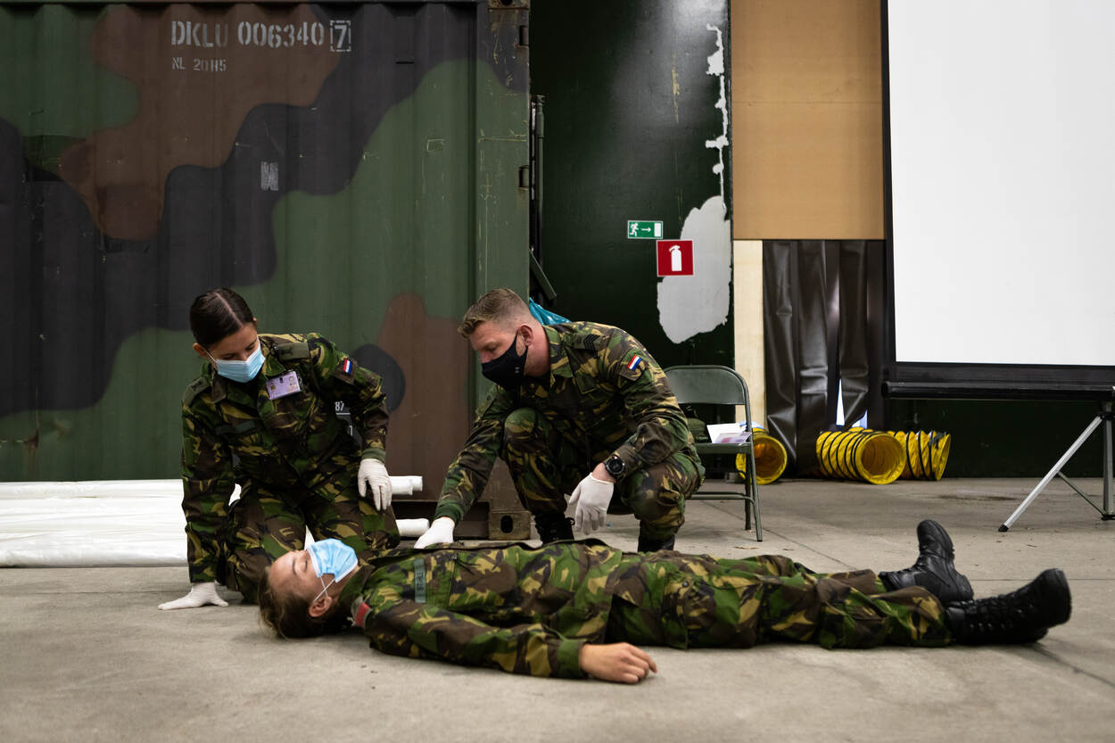 Omdat het momenteel even iets te druk is op de Koninklijke Militaire Academie te Breda week een klasje luchtmachtcadetten uit naar de vliegbasis Gilze-Rijen. En de patiënt in kwestie, tsja die moet zijn mondkapje gewoon ophouden tijdens de behandeling. Marinekorporaal Gregory Fréni was degene die op het moment van de opname het fototoestel vast had.