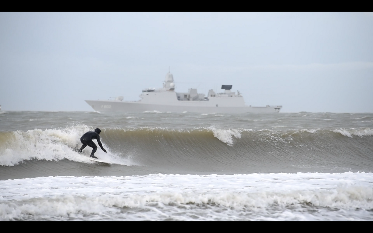 Op deze foto komen de 2 werelden van kwartiermeester-duiker bij de Mijnendienst Andrew Rep samen. Terwijl hij indraait voor een ‘goeie’ golf, vaart op de achtergrond een luchtverdedigings- en commandofregat van de Zeven Provinciën-klasse voorbij. Laat Andrew ruim 10 jaar op deze schepen gevaren hebben.