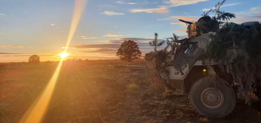 Kapitein Rick de Greef drukte deze sfeervolle plaat af, toen het ochtendzonnetje de Truppenübungsplatz Altmark bescheen. Een kleine (uiteraard op corona geteste) delegatie Nederlandse militairen beoefende onlangs samen met Duitse, Belgische, Tsjechische en Noorse collega’s het vertragend gevecht. In het kader van de komende deelname aan de NATO enhanced Forward Presence in Litouwen. Op de bewuste ochtend van de foto deed zich nog geen wapengekletter voor en was de heide een plek van rust en bezinning.