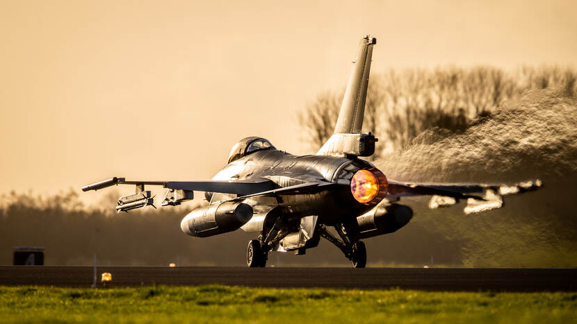 November is voor de vliegbases Volkel en Leeuwarden traditioneel de maand van het nachtvliegen. Op de kiek een F-16 die met volle naverbrander vanaf Leeuwarden de duisternis tegemoet gaat. Gelukkig voor defensiefotograaf sergeant Jan Dijkstra vertrok het toestel voordat de duisternis inviel. Daardoor slaagde hij erin veel mooie details op beeld te bevriezen.