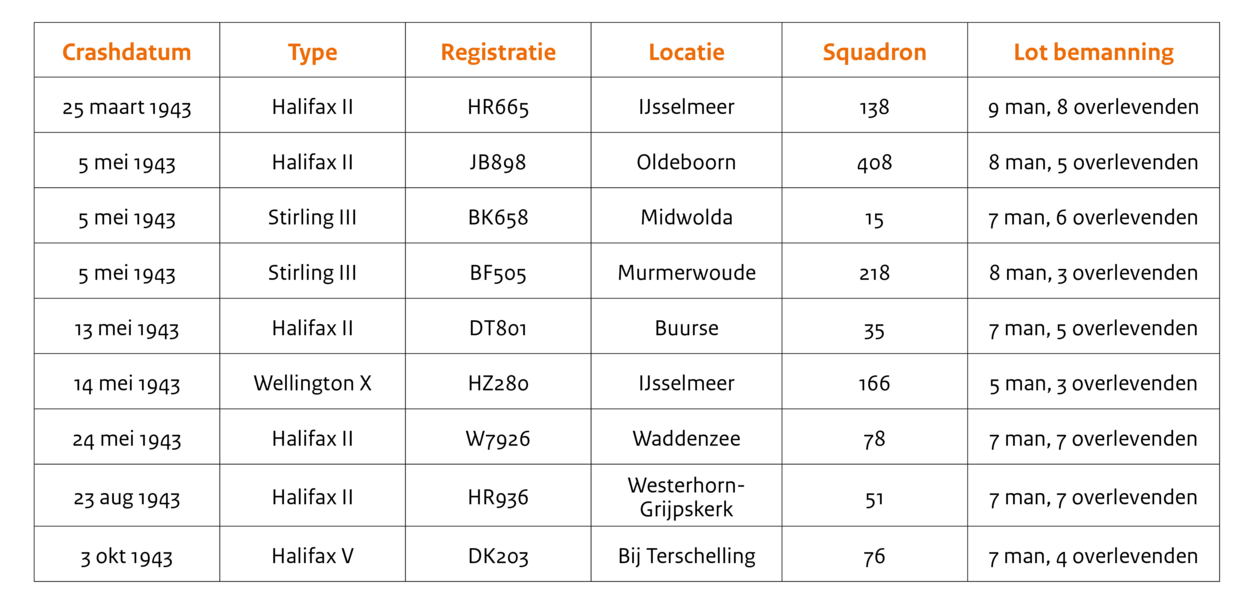 Bij de overgebleven vliegtuigen gaat het om bommenwerpers van vier verschillende typen: Lancasters, Sterlings, Wellingtons en een enkele Hampden. Daar waar de laatste vier personen aan boord had, telden de andere drie typen meestal zeven of acht bemanningsleden. Met die wetenschap heeft de redactie de lijst van neergeschoten of verongelukte toestellen nog eens goed bekeken. Daarbij valt op, en dat is een trieste conclusie, dat er toch wel heel veel geallieerden het leven hebben gelaten in de luchtoorlog; het gros van de neergestorte vliegtuigen had zeven man aan boord en in de meeste gevallen kwamen ze allemaal om.