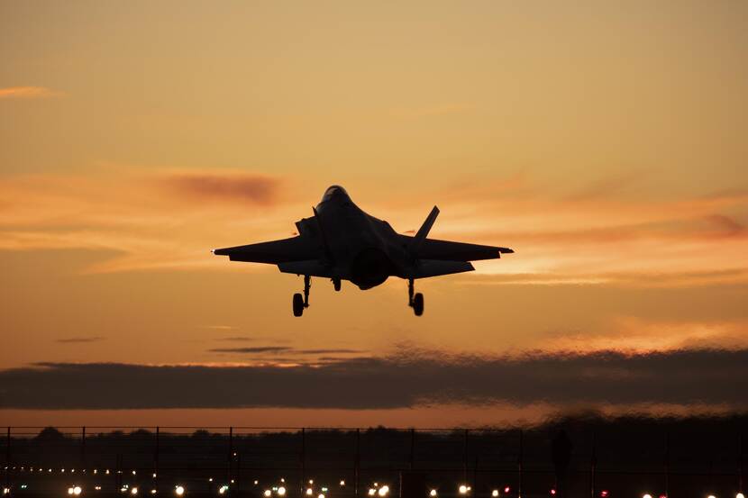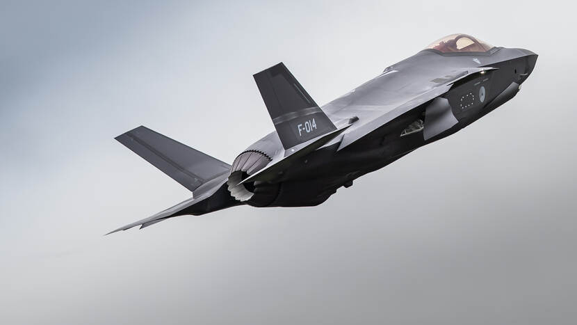 Onze fotograaf sergeant Jan Dijkstra nam boven Vliegbasis Leeuwarden een fraaie opname van de F-35 met registratie F-014. Het splinternieuwe toestel vloog van de fabriek in het Italiaanse Cameri rechtstreeks naar Leeuwarden. Nederland krijgt voorlopig 46 toestellen. Dat zijn er al 9 meer dan de initiële 37.