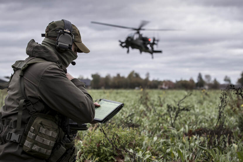 Door Covid-19 is oefenterrein Marnewaard in Noord-Nederland beperkt bruikbaar voor close air support oefeningen. En daarom werd oefening Purple Windmill dit jaar op een defensielocatie bij het dorp Vredepeel in Limburg gehouden. Fotograaf sergeant-majoor Maartje Roos brengt met deze foto de samenwerking tussen eenheden in de lucht en op de grond in beeld. Naast Nederland deden ook België, Denemarken en Frankrijk mee aan Purple Windmill.