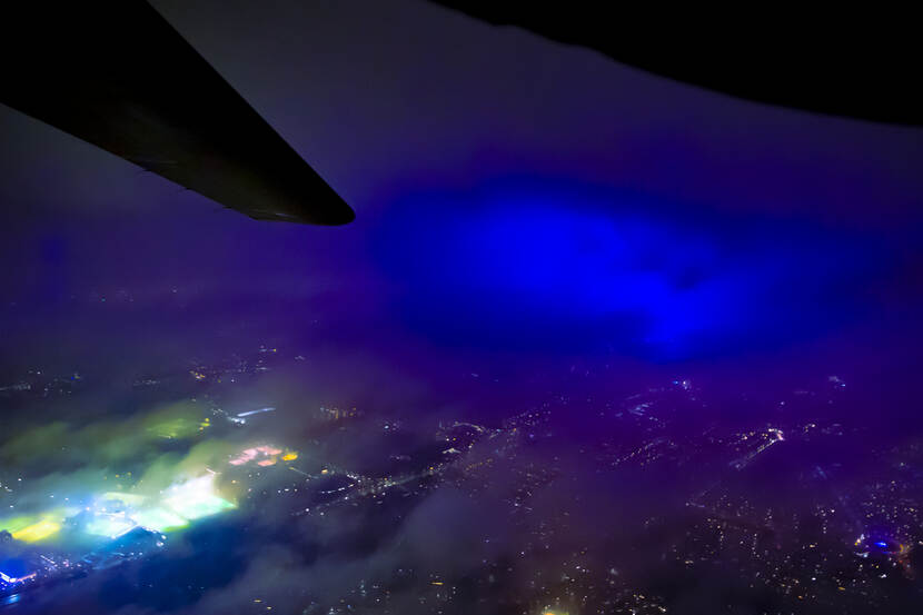 Het jaarlijkse lichtkunstfestival GLOW Eindhoven zette het centrum van de lichtstad dit keer in een mooi blauw neonlicht. Helaas was er door de laaghangende bewolking vanuit de lucht soms weinig van te zien. Fotograaf sergeant Cristian Schrik tekende voor de opname.