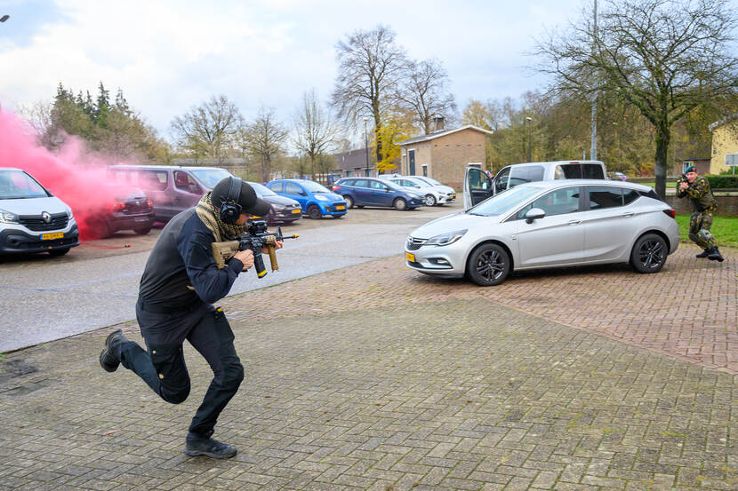 Fotograaf René Verlegh liet zijn Nikon klikken als een razende, toen leden van de Hoog Risico Beveiliging van de marechaussee op Kazerne Nieuw-Milligen met het lange wapen een aanval afsloegen. Natuurlijk ging het hier om een oefening.