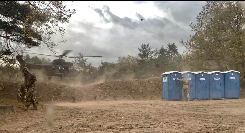 Sergeant van de mariniers Pieter Ros legde vast hoe de downwash van een Cougar transportheli vat kreeg op een rijtje dixi’s. Voordat de portable toiletten weggeblazen zouden worden, zag een operator van het Korps Commandotroepen kans het plastic sanitair op zijn plaats te houden. De vliegbewegingen boven de Oirschotse Heide behelsden het beoefenen van special operations drills.