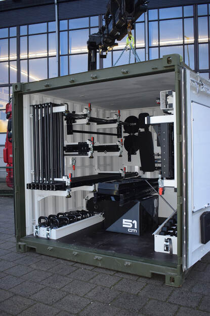 Defensie heeft 25 mobiele sportscholen aangeschaft. Deze fitnesscontainers passen in vliegtuigen, op vrachtwagens, treinen en schepen zodat ze makkelijk naar oefeningen en missiegebieden kunnen worden verplaatst. De eerste werd woensdag in gebruik genomen.