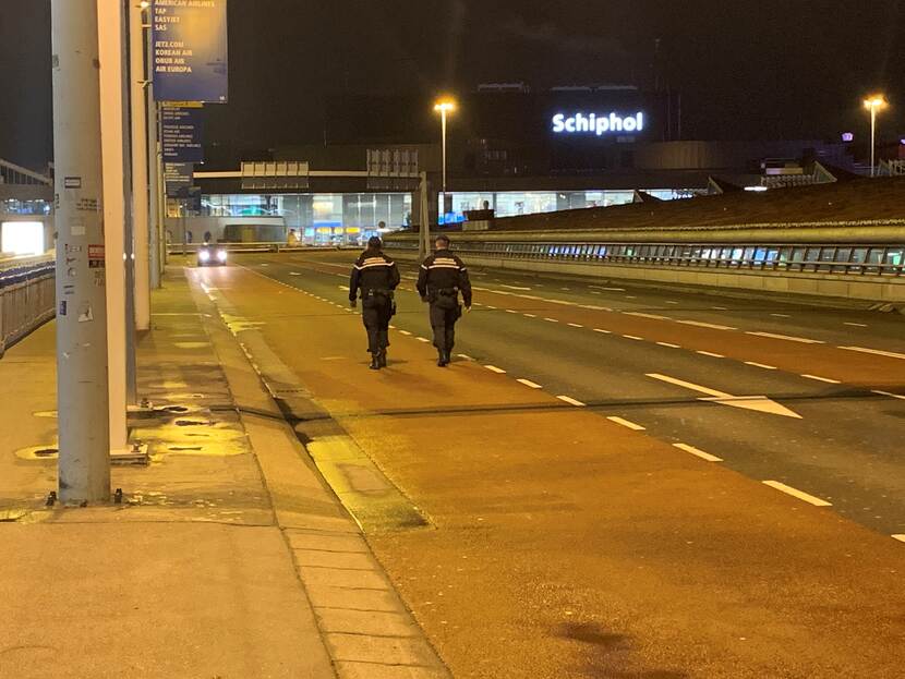 Dit beeld van de Vertrekpassage Schiphol is genomen op dinsdag 26 januari, enkele minuten na het ingaan van de avondklok. Opperwachtmeester Peter Kooistra schoot de foto met daarop twee surveillerende collega’s van de Politiedienst Schiphol. Even ervoor was het nog druk met auto’s die vertrekkende reizigers wegbrachten. Na negenen was het gauw gedaan met de pret. “Treurig”, aldus Peter.
