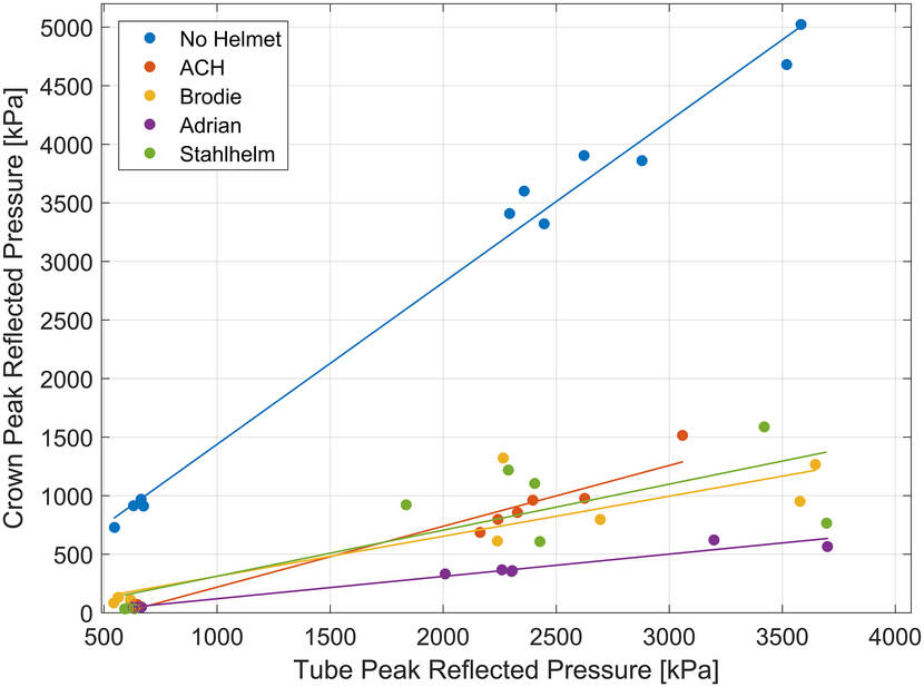 Het zijn de onderzoekers Joost Op ‘t Eynde, Allen W. Yu, Christopher P. Eckersley en Cameron R. Bass die het beschermende effect van de Engelse Brodie-helm, de Duitse Stahlhelm, de Franse Casque Adrian en de Amerikaanse Advanced Combat Helmet onderzochten. Daarvoor werd de hoofdbescherming op poppen gemonteerd. Een drukgolf uit een schokbuis simuleerde een ontploffing van bovenaf. De duur en overdruk van de drukgolven kwamen overeen met een explosie op korte afstand van de meest gebruikte kalibers granaten uit de Eerste Wereldoorlog.