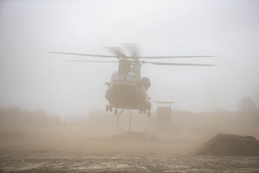 Al hoverend boven de geul, de oever in dit oefenscenario, is het passen en meten voor de loadmaster en de Chinookvlieger, die de brug over het gat in het oefengebied op de Arnhemse Heide plaatsen. Complicerende factor: de helikoptercrew krijgt een brown-out op de koop toe. Het opstuivende zand ontneemt hen misschien deels het zicht, maar de brug vindt perfect zijn plek. Even later landt de Chinook in het zijterrein, waarna de luchtmobiele genisten zich tactisch uit de heli bewegen en hun brug gereed maken voor gebruik.