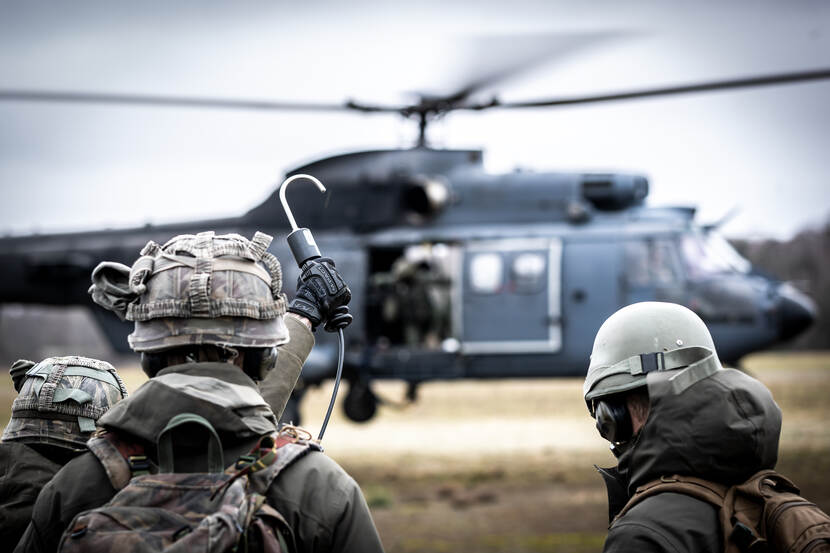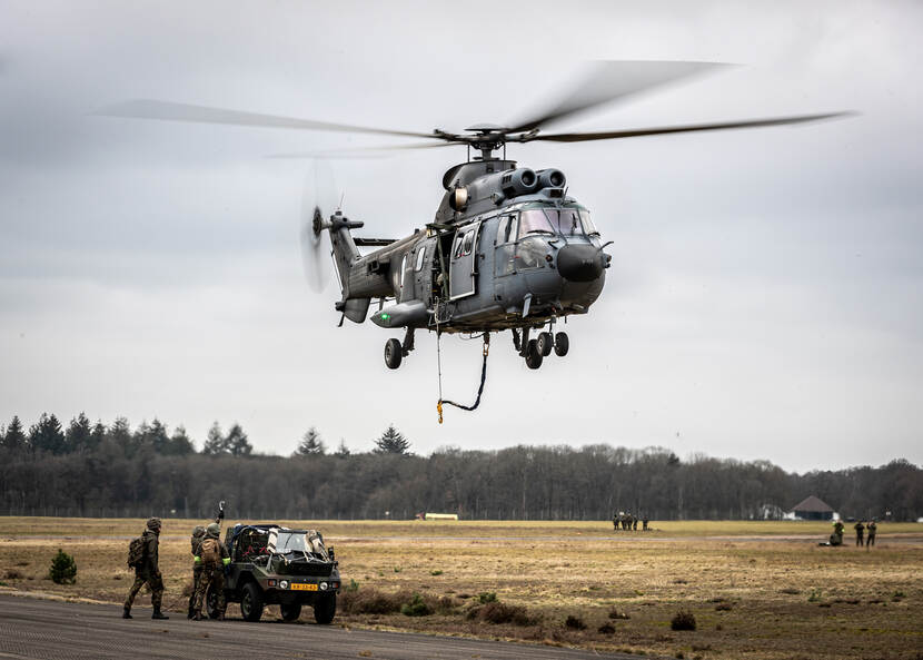 Dat er deze week, zij het op iets kleinere schaal en met de nodige aanpassingen, weer samen gehesen en geslingerd kon worden, stemde alle spelers gelukkig. Ook voor Cougarvlieger kapitein Sacha was het alweer even geleden dat hij in groter verband trainde. “We oefenen wel vaker met externe ladingen, maar meestal op kleine schaal. Dan droppen we een auto of netlading. Bij de slingery vliegen we met meerdere helikopters, bijzondere ladingen én werken we samen met alle grondtroepen. Dat maakt het uitdagend, maar vooral ook hartstikke leuk.”