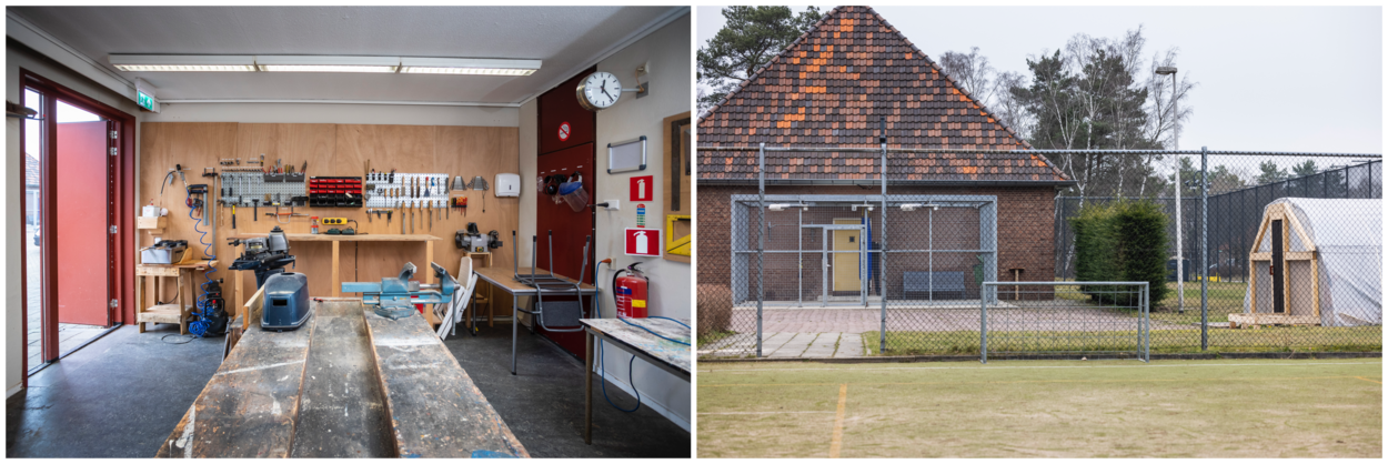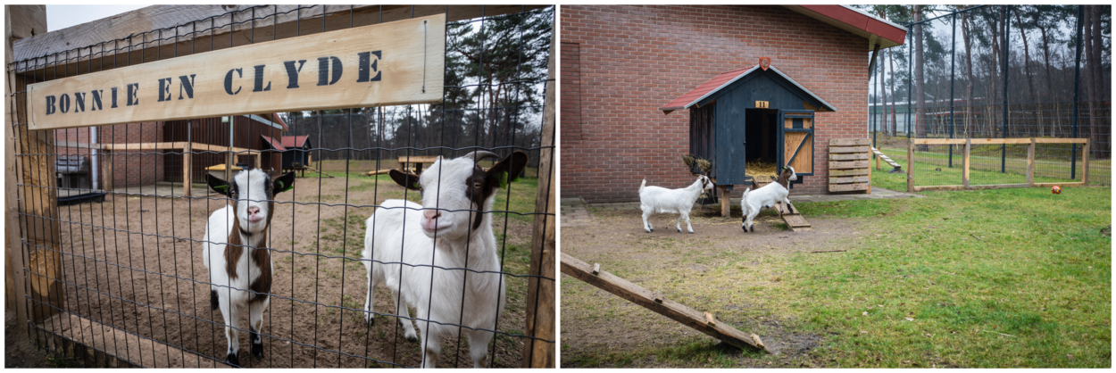 De meldkamer en gang met cellen liggen op luttele meters afstand van elkaar. Einde gang rechts een deur naar de luchtkooi, aan de andere kant de woonkamer met eettafel. De keukenramen bieden vrij uitzicht op het grote sportveld met aangrenzend de houtzagerij, broeikas en een kleine wei waar we stuiten op cel nummer elf: het getimmerde geitenverblijf van moedergeit Bonnie en dochter Clyde. Een projectje van adjunct-directeur adjudant Willem Gorter. ”Dieren creëren vaak veel rust. Er wordt in buitenlandse gevangenissen ook al mee geëxperimenteerd. Ik dacht, waarom doen we dat hier eigenlijk niet? Goed voor het koppie."
