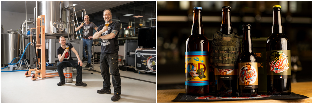Links het brouwersgilde van Puik in Apeldoorn. Rechts de drie bieren die aan Defensie worden geleverd, desgewenst met een scherfwerend vest.