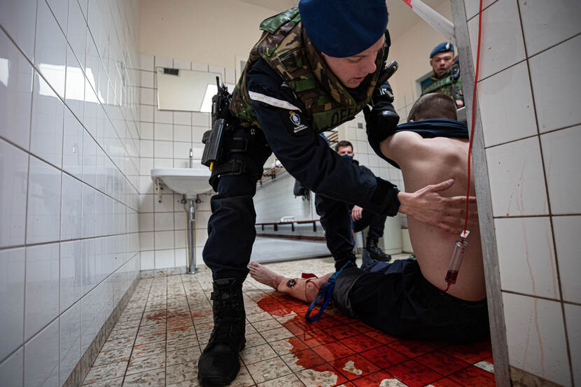 Sergeant-majoor Maartje Roos schoot deze aangrijpende plaat tijdens de opleiding tot operator bij het Eskadron Hoog Risico Beveiliging, onlangs op Kamp Nieuw-Milligen. In de derde week werden de deelnemers geconfronteerd met realistische scenario’s die moeten aantonen of zij uit het juiste hout zijn gesneden.