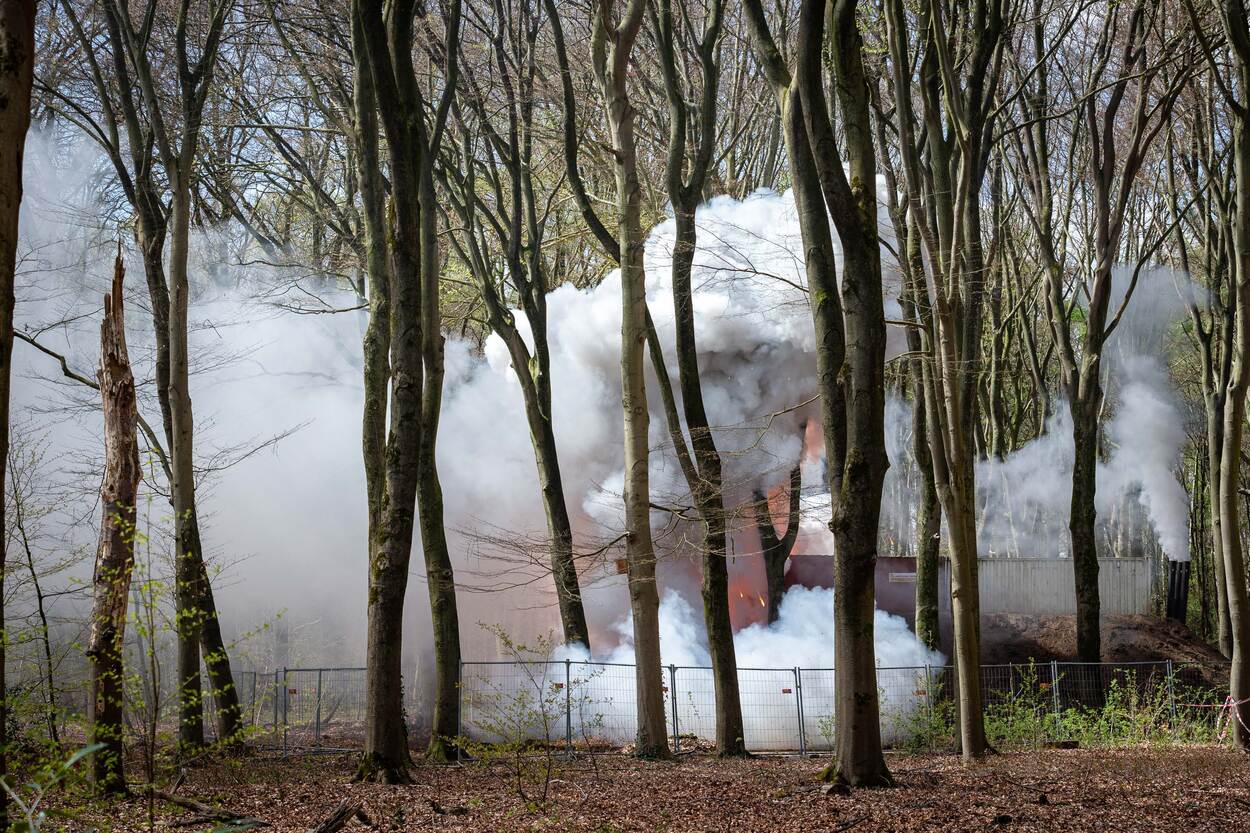 En dan is het even voor één uur ’s middags. De wegen zijn afgezet, bewoners in de directe omgeving moeten binnen blijven. Drie, twee, een….en een doffe harde klap volgt. Tot 1.600 graden Celsius moet het nu in de container zijn. Dikke zwartgrijze en later witte rook komt uit zowel de speciaal gemaakte ‘kachelpijpen’ en de voorkant van de container. Een meetteam van het RIVM controleert op giftige stoffen.