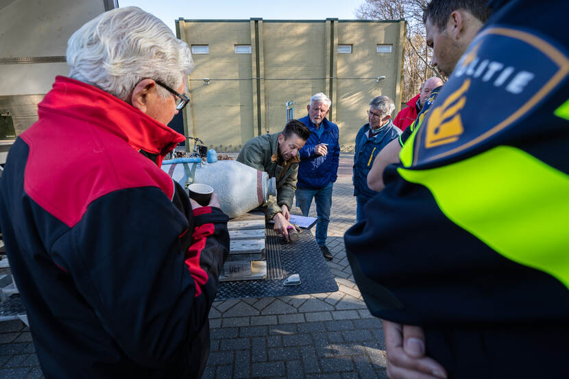 “Dat is een flinke melkbus!”, grapt meneer Klijn Velderman (83) bij het zien van de Amerikaanse brandbom. “Goed voor carbidschieten!”. Velderman heeft zich met een aantal vrijwilligers van de voetbalclub verzameld rond een vrachtwagen van de EOD in het Gelderse Epse. “Hebben jullie hem al uit de grond gehaald?”, vraagt iemand anders. De mannen vinden het bezoek van Defensie reuze-interessant. Daar had majoor Peter van de EOD al rekening mee gehouden. Speciaal voor vandaag heeft hij een al onklaar gemaakte versie meegenomen. “Komt uit onze studieverzameling”, vertelt de EOD'er terwijl hij bij het gietijzeren gevaarte van bijna een meter lang tekst en uitleg geeft.