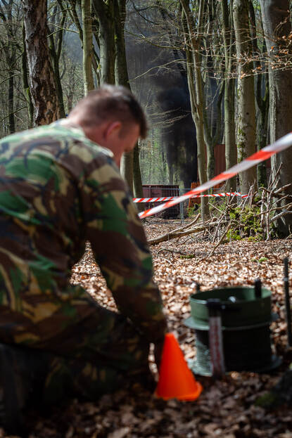Maar is verplaatsen geen optie? “Nee, de bom heeft een dunne wand. Die is bij het neerkomen waarschijnlijk ingedeukt. We weten niet in hoeverre de binnenkant beschadigd is. Als we de ontstekers eruit halen, kan er zuurstof bij de fosforlading komen die de brandemulsie van diesel en magnesium in brand zet. Dat is niet wenselijk. Daarom hebben we ter plekke een springlading van twee kilo op de bom geplaatst waarna die gecontroleerd uitbrandt.”