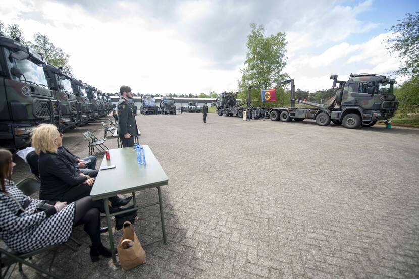 Het inzetten van de Scania’s bleek dé oplossing, vertelt majoor Posthouwer. “Voor iedere decorandus was een voertuig beschikbaar. De militair mocht zoveel genodigden meenemen als er in de Scania passen. Met deze compartimenten creëer je bubbels: zo kun je tóch meerdere mensen uitnodigen voor de ceremonie, terwijl je de afstand kunt bewaren. En iedereen zat nog droog ook. Maar vanwege het mooi weer kon de uitreiking toch in de buitenlucht plaatsvinden. Door tafels neer te zetten was de onderlinge afstand nog steeds gegarandeerd.”
