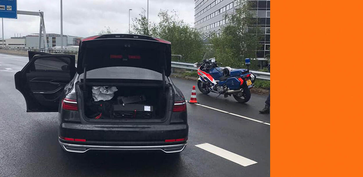 Op Schiphol deed zich deze week een vergelijkbaar voorval voor (foto). Daar ging het om een Nederlander die in een auto met Duits kenteken reed. Bij een controle toonde hij een vals Frans paspoort en ging er vandoor toen dat werd ontdekt. Twee marechaussees achtervolgden hem en wisten hem te overmeesteren. Bij verder onderzoek bleek dat hij in Nederland nog 1600 euro boete en 43 dagen cel had uitstaan en in Duitsland zelfs nog 15 jaar gevangenisstraf. Hij zit vast in afwachting van eventuele uitlevering aan Duitsland.