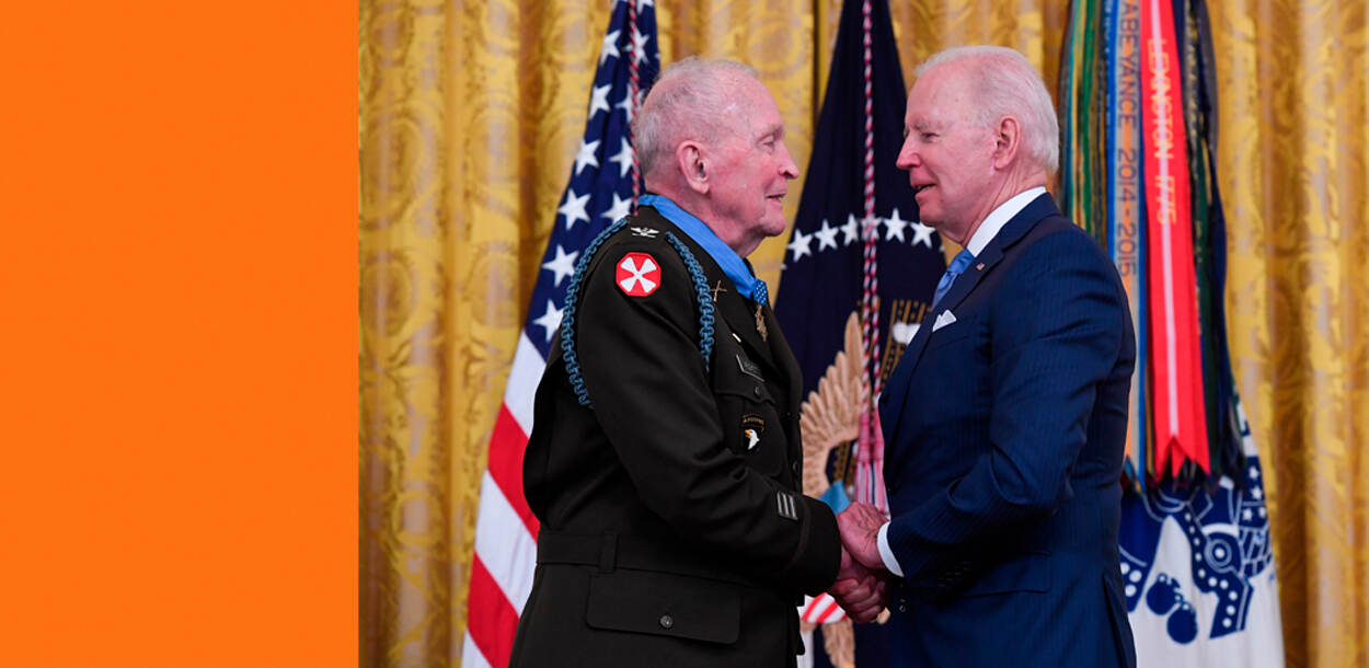 De 94-jarige kolonel buiten dienst Ralph Puckett Jr. heeft dik 70 jaar na zijn heldhaftig optreden in Korea de Medal of Honor ontvangen uit handen van de Amerikaanse president Joe Biden.
