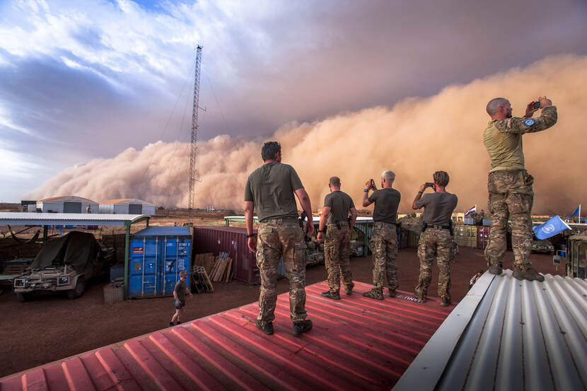 Na een lange week met het SOLTG buiten de poort te hebben gebivakkeerd, waren we bezig met het wapen- en voertuigonderhoud op een afgeschermde voertuigplaat. Plotseling ging er een alarm af. Iedereen werd uit veiligheidsoverwegingen verzocht de containers in te gaan, omdat een enorme harmattan (zandstorm, red.) het kamp naderde. In de verte zag ik een muur van rood zand onze kant op komen. Het was oprecht heftig. Binnen no time zou het hele kamp onder een stoflaag verdwijnen.
