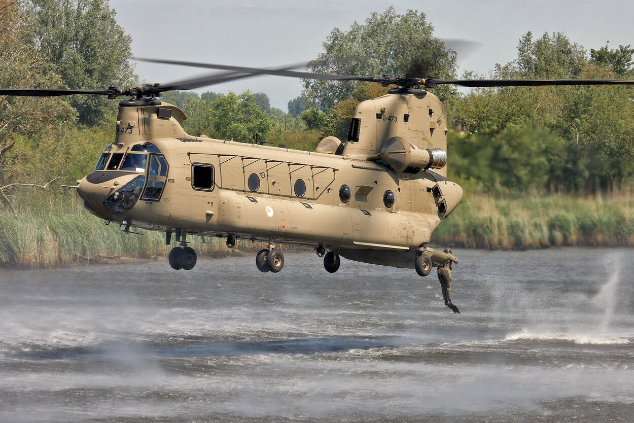 Marco Ferrageau stuurde een foto van een nieuwe Chinook van het Defensie Helikopter Commando. De heli was bezig met een zogenoemde helocast oefening. Hierbij springen operators van het Korps Commando Troepen bij lage snelheid uit de kist, in het water.