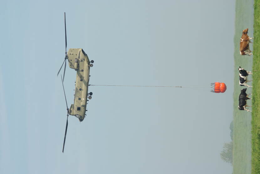 Maikel de Vaan spotte een nieuwe Chinook Foxtrot van 298 Squadron tijdens het certificeren van vliegen met de Bambi Bucket. De eerste testvlucht vond plaats boven de Bergsche Maas ter hoogte van de Overdiepse Polder. De koeien langs de oever keken er geamuseerd naar.