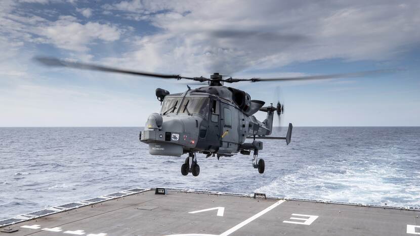 Op weg naar Japan wordt er op volle zee uiteraard geoefend. Fly en cross deck operations komen met regelmaat voor bij de Britse Carrier Strike Group. De deelnemende Zr.Ms. Evertsen kreeg onlangs bezoek van de boordhelikopter van het Engelse fregat HMS Richmond. Dat was om het ‘oplanden’ te beoefenen (het landen van een heli op een dek) én de commandant van de Richmond voor een beleefdheidsbezoek af te zetten. Foto: Zr.Ms. Evertsen.