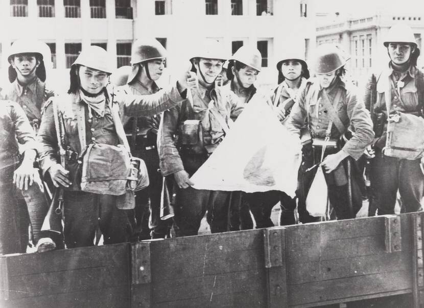 KNIL-militairen staan met een buitgemaakte Japanse vlag op een open vrachtauto op het Stationsplein te Batavia op 1 maart 1942. Foto: NIMH.