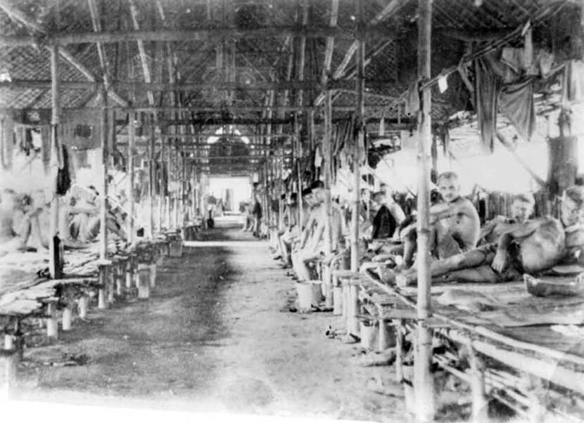 Een mogelijk in het geheim genomen foto van het krijgsgevangenenkamp in Kanchanaburi in Thailand, waar Bouwens verbleef. Foto: ww2today.