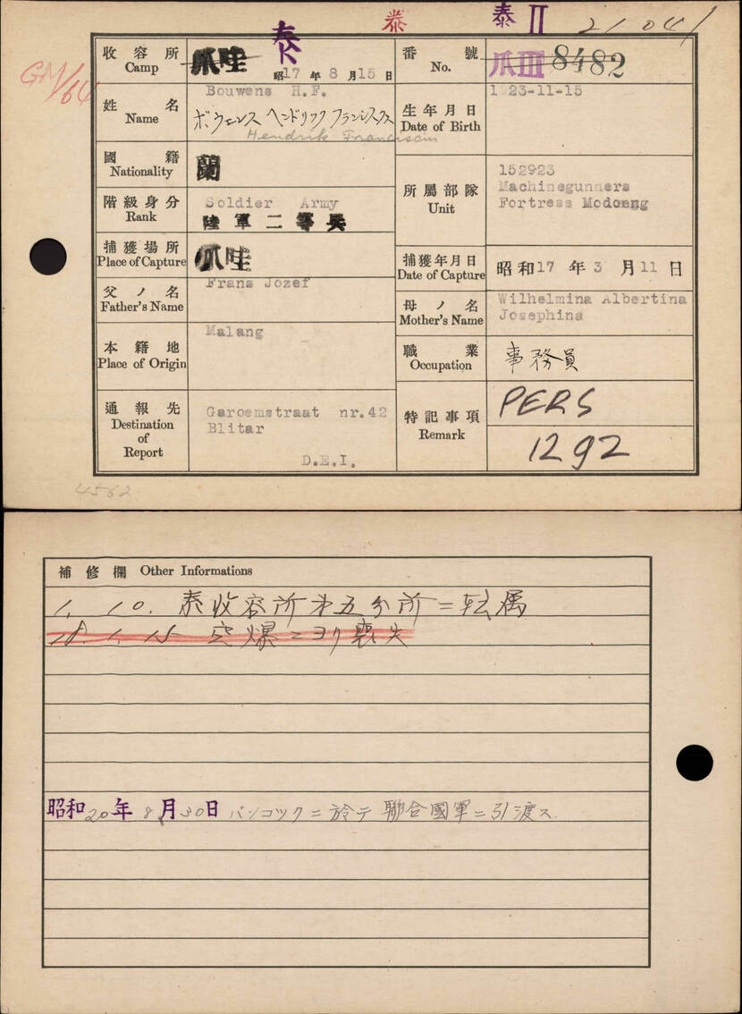 Bouwens wordt keukenhulp en krijgt soms restjes voedsel. Die eet hij overigens niet zelf op, maar geeft het voedsel weg aan de krijgsgevangenen die het harder nodig hadden. Hij vertelt dat de Japanners hen niet zo slecht behandelden. “Hun Koreaanse helpers mishandelden ons." Uiteindelijk brengt Bouwens 3,5 jaar door in gevangenschap.