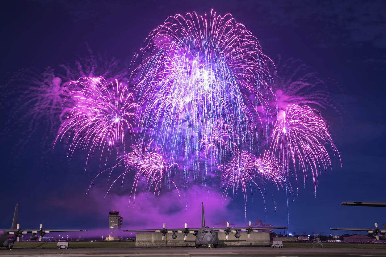 Vuurwerk explodeert achter een C-130J Super Hercules op Yokota Air Base in Japan. De kleurrijke show vormt het hoogtepunt van de Celebrate America viering. Dit lokale, jaarlijkse evenement biedt militairen en hun familie de gelegenheid met elkaar Independence Day te vieren. Sport, spel, muziek en een mooi vuurwerk zijn de voornaamste ingrediënten. De foto is van Senior Airman Brieana E. Bolfing.