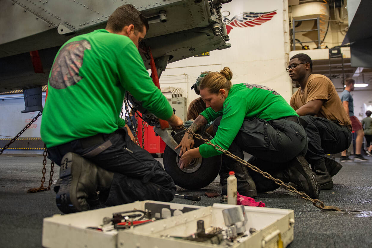 Nog een foto van specialist Berlier aan boord van USS America. Onderhoudspersoneel van Helicopter Sea Combat Squadron 25 is druk bezig met een MH-60S Sea Hawk. De Amerikaanse vloot patrouilleert in de Pacific om de stabiliteit in de regio te bevorderen.