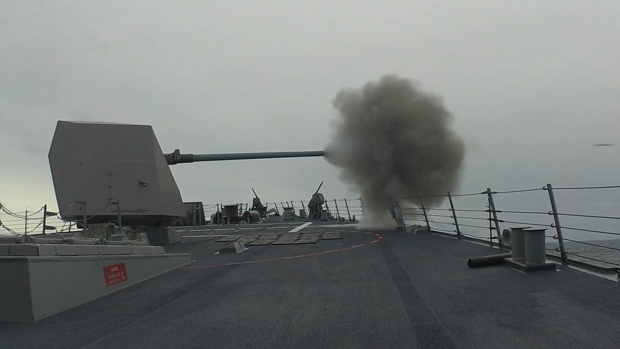 Specialist 2nd Class Andrea Rumple drukte op het juiste moment af toen het geschut van de USS Roosevelt een Mark 45 5 inch granaat afvuurde. De fotograaf legde het beeld vast tijdens een oefening op de Noordelijke IJszee. Het geleide wapenfregat maakt deel uit van de Amerikaanse Sixth Fleet en heeft de Spaanse havenplaats Rota als tijdelijke thuisbasis. Haar area of operations zijn de Europese en Afrikaanse wateren.