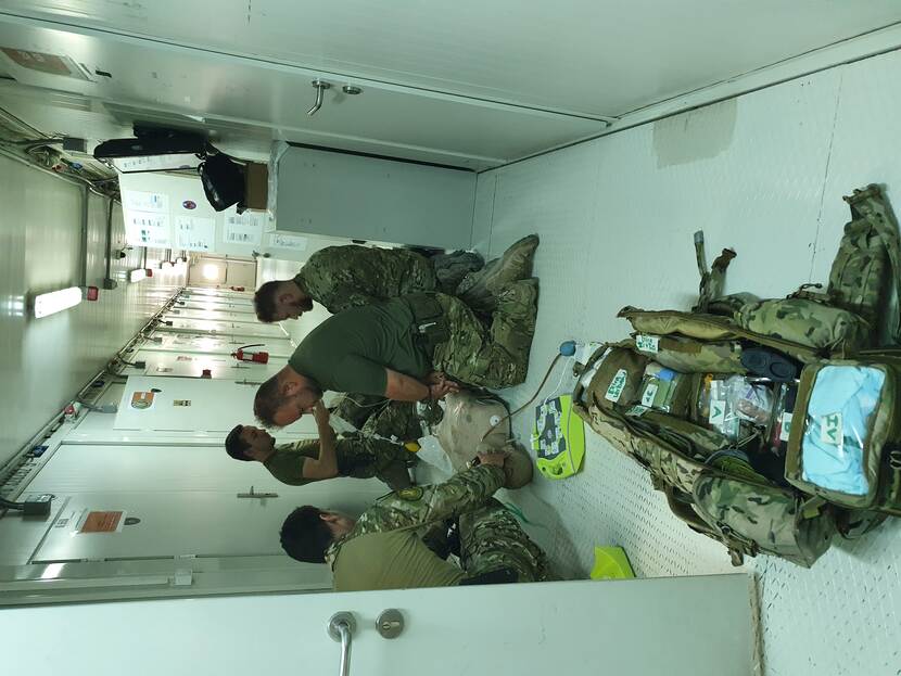 Leden van het National Support Element 1 (NLD) CBMI in het Iraakse Erbil werden gefotografeerd tijdens een oefening ‘hartstilstand bij een collega’. De arts begon met beademen, terwijl een verpleegkundige de medicatie gereedmaakte. Intussen zorgde de ambulancechauffeur voor het infuus. Een passant die toevallig in de Nederlandse kantoorvleugel aanwezig was, assisteerde bij de hartmassage. Bij een buitentemperatuur van rond vijftig graden Celsius is dit een zeer uitputtende bezigheid. De foto is van sergeant-majoor Jacco.