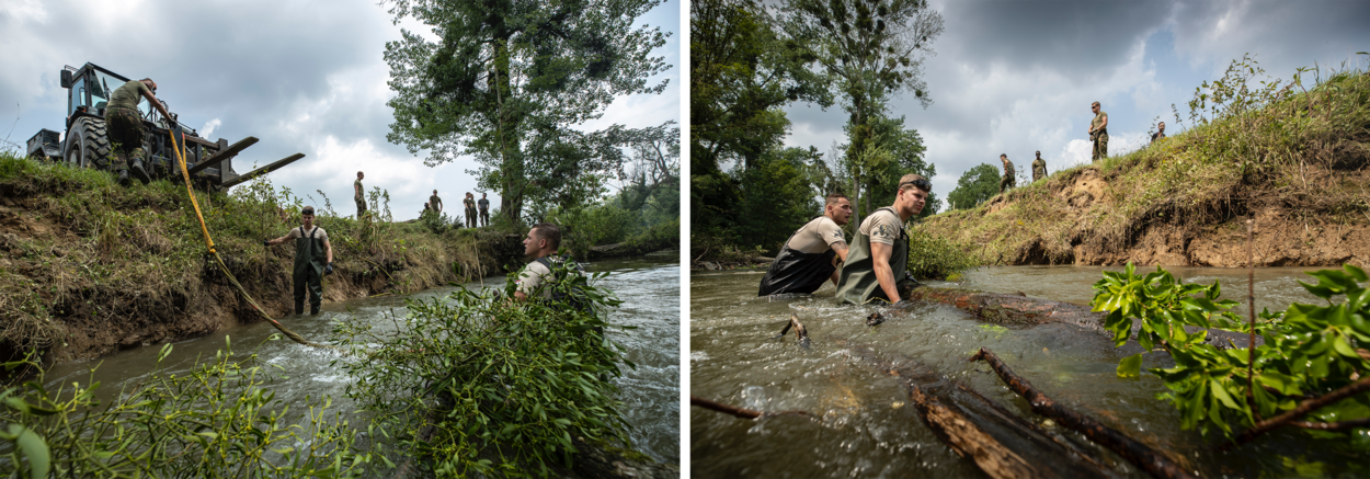 Hoewel het grootste risico lijkt te zijn geweken, is er voor de genisten ook deze week nog genoeg te doen. Er liggen omgevallen bomen op lastig te bereiken plekken en de beken en rivieren moeten vrij gemaakt worden van opstoppingen door meegevoerd materiaal. Met grof geschut trokken de mannen en vrouwen van de genietroepen erop uit om deze waterwegen vrij te maken. Een urgente klus. Komend weekend kan er weer neerslag vallen en moet het water goed afgevoerd kunnen worden.