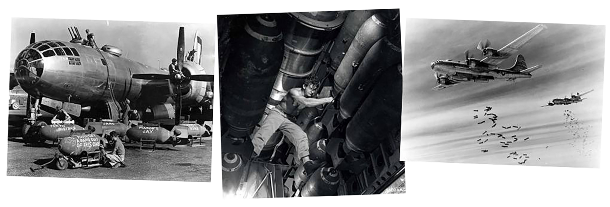 Op deze manier volgen talloze aanvallen, waarmee de oorlogsindustrie van het keizerrijk grotendeels wordt stilgelegd. Maar Japan geeft zicht niet over, waarna de Amerikanen besluiten tot twee nucleaire aanvallen. Over het nut en de noodzaak van de atoombommen in relatie tot het beëindigen van de strijd is veel geschreven. Feit is dát ze plaatsvonden.