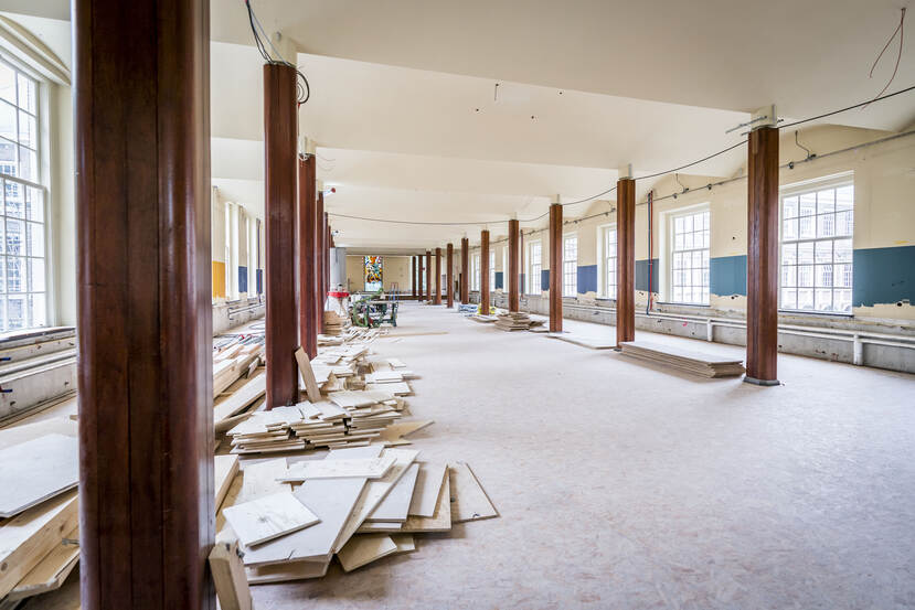 De rondleiding over de ‘bouwput’ begint op de zolder waar van oudsher de technische ruimtes zijn ondergebracht. “Dat blijft ook na de renovatie zo”, benadrukt Van Rijnsbergen. “Al wordt het heringericht en vernieuwd met onder meer een watermist-sprinklerinstallatie, ventilatieleidingwerk, elektra, ICT en een warmtewisselaar.