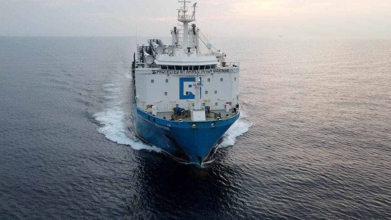 Foto boven: MS Rolldock Storm, protected by armed Dutch Marines.